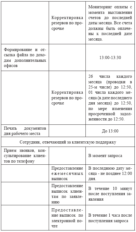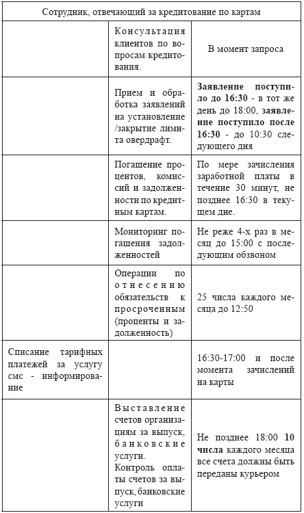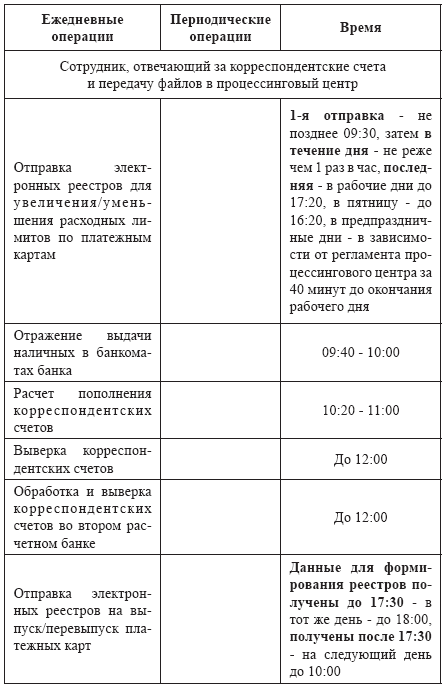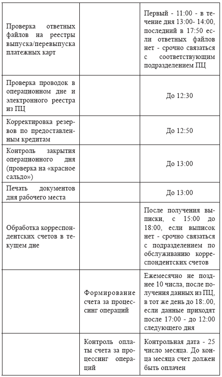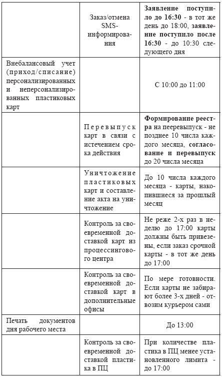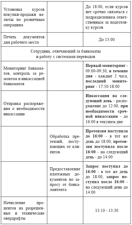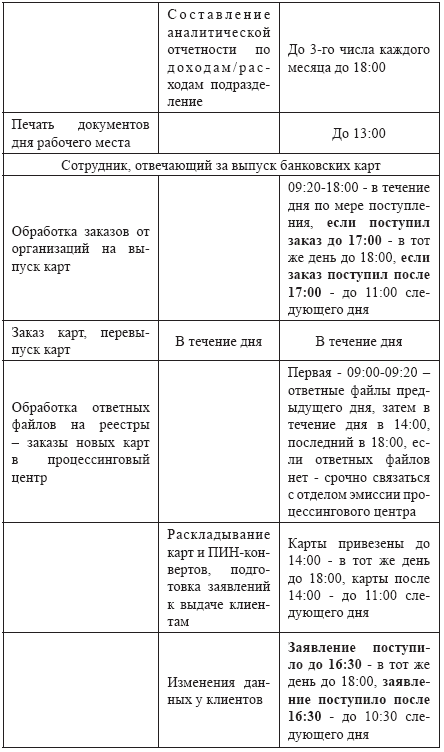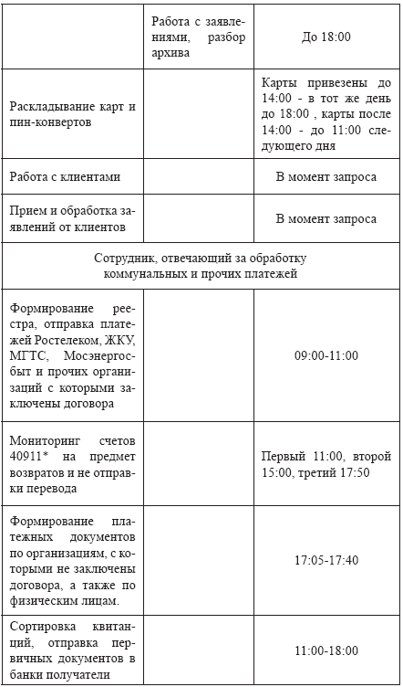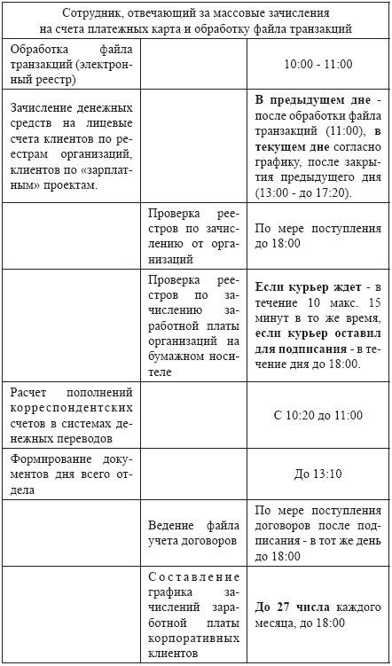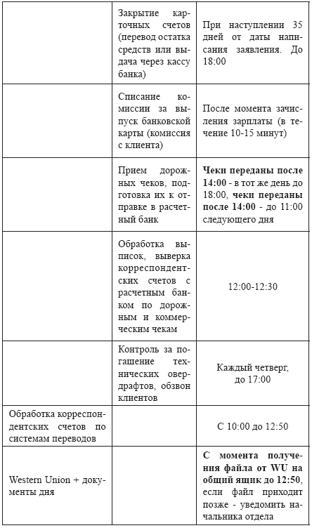 Как уже упоминалось в начале раздела, использование кадров, не имеющих большого профессионального опыта, возможно только при четкой регламентации их деятельности. Таким образом требуется создать четкое операционное расписание их действий в течении рабочего дня. Но при этом деятельность подразделения становится более оптимальной при наличии четкого временного алгоритма деятельности каждого сотрудника. В качестве примера приводится операционное расписание подразделения по обслуживанию платежных карт, а также денежных переводов, дорожных и коммерческих чеков (в рамках приведенной выше структуры, данное подразделение называется «отдел текущих операций»).