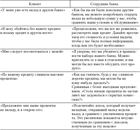 Возражения искренние и обоснованные. Эти возражения классифицируются как искренние, потому что клиент в них верит, а обоснованные – потому что ни одна банковская услуга не бывает совершенной. Следовательно, нужно проявить благоразумие и согласиться с этими возражениями. Нередко случается, что в момент продажи проницательный клиент угадывает важнейший момент, слабое место, главный недостаток предложения. В этом случае следует принять возражение и отдать должное клиенту, его знанию данного продукта и банковской деятельности в целом.