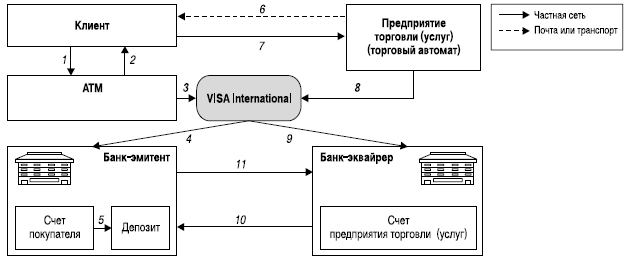 1, 2- клиент через банкомат (ATM) посредством обычной банковской кредитной (дебетной) карты данной платежной системы загружает свою карту VISA Cash; 3, 4- информация о денежных средствах (лимите), которые клиент загрузил на карту VISA Cash поступает через VISA International в банк, обслуживающий данного клиента (банк-эмитент); 5 – сумма, эквивалентная сумме загруженных средств, списывается со счета клиента в пользу банка-эмитента; 6, 7 – оплата товаров (работ, услуг): на стоимость приобретенных товаров (работ, услуг) уменьшается лимит карты; 8, 9 – данные о приобретенных товарах (работ, услуг) через VISA International поступают в банк, обслуживающий предприятие торговли (услуг) – банк-эквайрер; 10, 11 – взаимозачеты осуществляются между счетом предприятия и депозитным счетом покупателя.