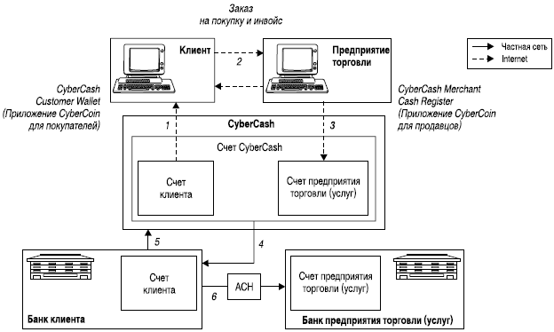 1 – «Электронные деньги» CyberCoin пересылаются персональный компьютер клиента, на котором инсталлированно специальное программное обеспечение «CyberCash Customer Wallet», предназначенное для осуществления платежей; 2 – оплата клиентом товаров (работ, услуг). «Электронные деньги» CyberCoin поступают на «CyberCash Merchant Cash Register» – приложение CyberCoin для предприятия торговли (услуг), которое инсталлировано на его персональном компьютере; 3 – предприятие торговли (услуг) переводит сумму оплаты в «электронных деньгах» на CyberCash; 4, 5- после заключения «мини-сделок» CyberCash посылает запрос (подтверждение) на денежный перевод в банк клиента; 6 – Взаиморасчеты осуществляются между банком клиента и банком предприятия торговли (услуг) через АСН