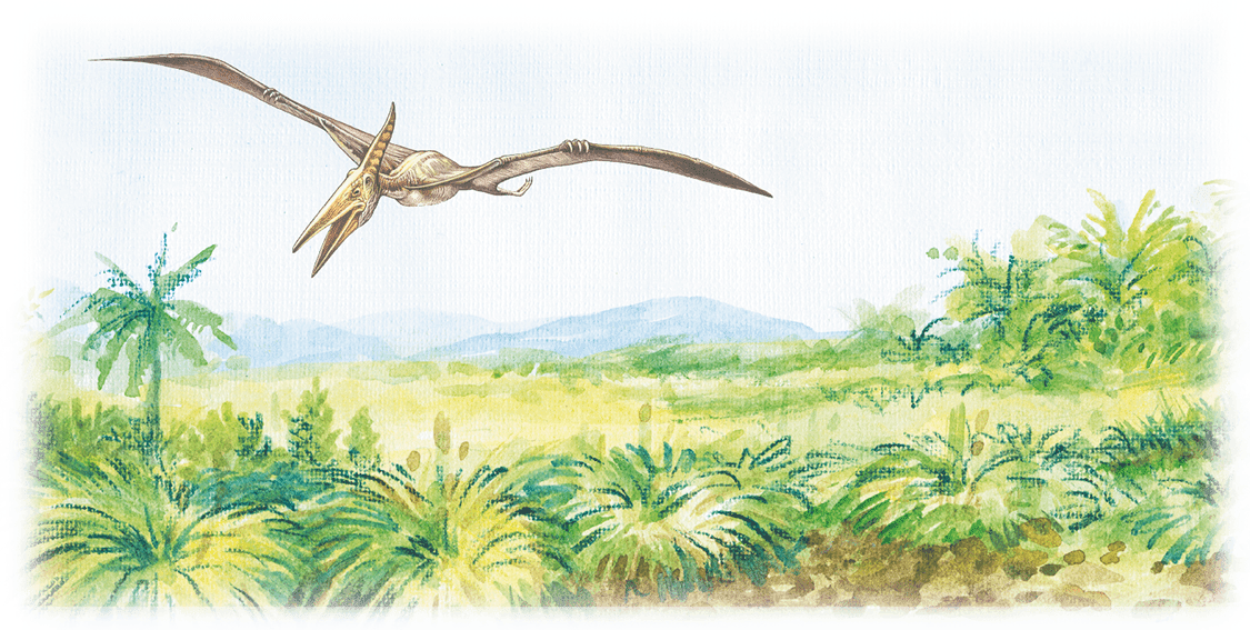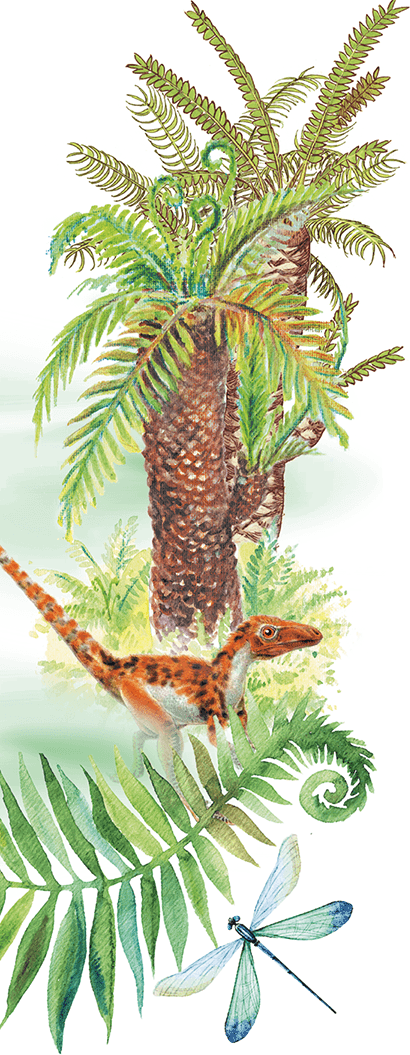 И было чем любоваться. Великолепную зелень папоротников дополняли шершавые стволы саговников. Одни из них напоминали прямые колонны, устремлённые ввысь на десяток и более метров. Вершину стволов венчали крупные стробилы – мясистые «шишки», обрамлённые пучком длинных и перистых листьев. Другие саговники были похожи на низкие кряжистые пни, густо обросшие сверху поникающими ветвями.