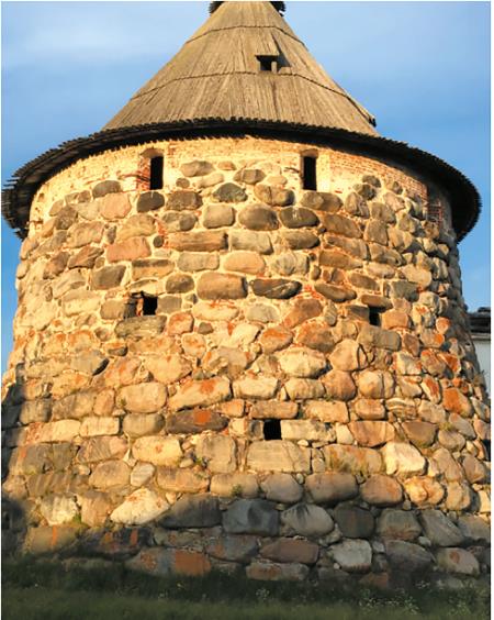 Но кто и как изначально построил стены, подняв валуны на семь и более метров? Плюс сооружение башен (рисунок 1), каменная часть которых в высоту достигает примерно 15 м! Экскурсоводы говорят, что в состав раствора, скрепляющего кладку, входили куриные яйца. Сколько же надо куриц и петухов для изготовления такого связующего вещества при создании только стены длиной в «одну Соловецкую версту» (1,25 км) и толщиной 6 м?