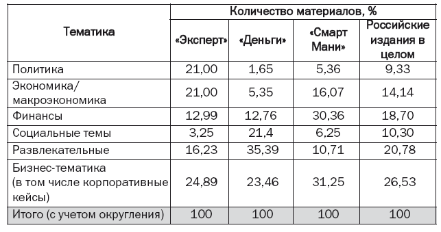 То же и в России – сохранивший черты академичности и обойму внештатных авторов из научных кругов «Эксперт» уделяет экономическим/макроэкономическим вопросам 27 % площади, а «потребительские» «Деньги» – лишь 6 %.