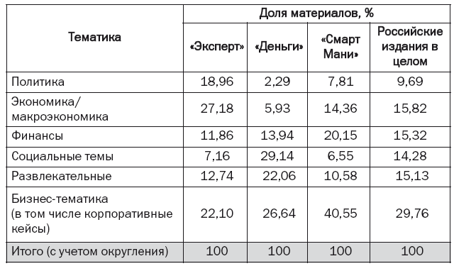 Удельный вес материалов бизнес-тематики в российских журналах удивляет: всего 29,8 % (по сравнению с 51,1 % в американских журналах). Причем даже таким показателем российские журналы «обязаны» корпоративной направленности журнала «Смарт Мани» (удельный вес материалов бизнес-тематики – 40,6 %). У «Денег» этот показатель – около 27 %, а у «Эксперта» – чрезвычайно низкие 22 %. (Имеет смысл также обратить внимание на сравнительно большие различия показателей у трех анализируемых российских журналов – от 22 % до 41 %, разброс – 19 процентных пунктов, у американских аналогов было 12.) Также мало количество материалов бизнес-тематики в российских деловых журналах – 26,5 % (на 20 процентных пунктов меньше, чем в американских).