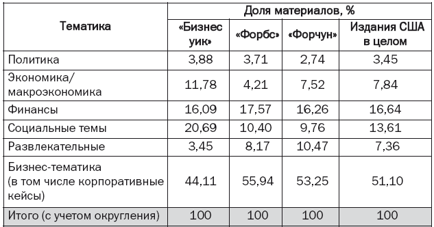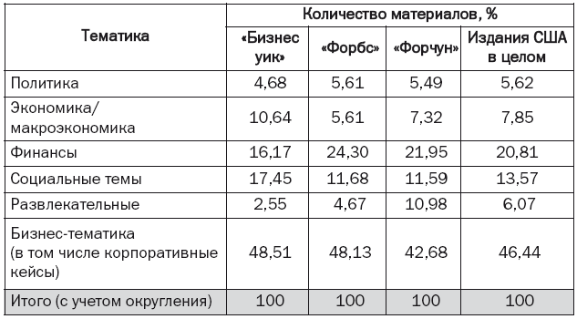 Содержательное ядро деловых изданий – бизнес-тематика (материалы о жизни корпораций) – занимает в американских журналах чуть более половины объема всех текстов. Следует отметить, что удельный вес таких текстов во всех журналах «большой тройки» варьируется незначительно – от 44 % в «Бизнес уике» до 56 % в «Форбсе». Число материалов бизнес-тематики в американских журналах почти столь же велико – 46 % (количество материалов на бизнес-темы в этих журналах также практически одно и то же – 42–48 %).