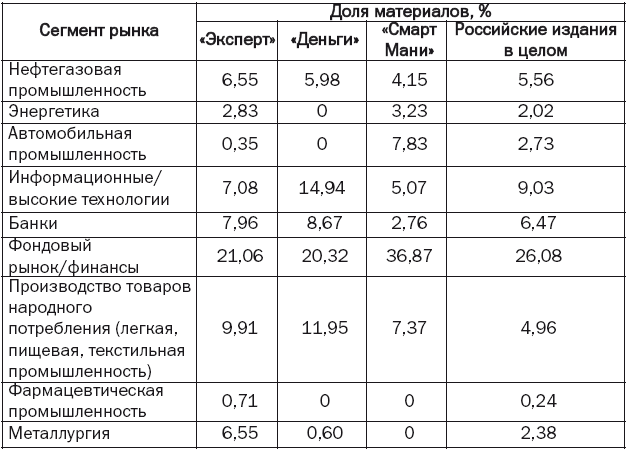 И, наоборот, схожие доли во всех российских деловых журналах занимают материалы о нефтегазовой отрасли (4–6,5 %), ритейле (3–7,8 %), банках (2,8–8,7 %).