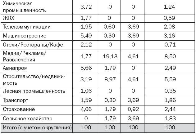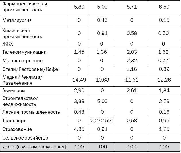 Любопытно и то, что сектор медиа/реклама/развлечения отображен в российских изданиях практически столь же полно, как и в американских – 8,5 % против 12 %, что, с нашей точки зрения, свидетельствует о развитии инфраструктурных элементов в российской экономике.