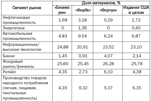 • во-вторых, получено еще одно подтверждение большей сегментации отечественной системы деловых журналов: удельный вес материалов на одни и те же темы в различных российских изданиях может сильно варьироваться, в то время как в американских масс-медиа проработка тем, связанных с разнообразными секторами экономики, находится практически на одном уровне.