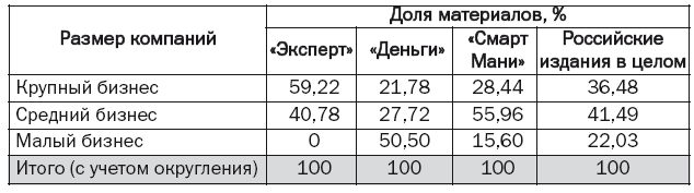 А «поляна» «Эксперта» – тексты о крупном бизнесе (почти 60 % площади). Наименее склонным к описанию деятельности крупных компаний оказались «Деньги» (22 %). Разница – в 38 %. В целом текстам о крупном бизнесе российские журналы посвящают 36,5 % площади.