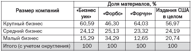 Американский журнал традиционно более склонен к описанию проблем большого бизнеса, нежели «усредненный» российский – 57 % площади, причем эта специализация характерна для всех представителей «большой тройки» – от 46 % у «Форбса» до 64 % у «Форчуна» (вариации – 18 процентных пунктов). По уровню внимания к проблемам большого бизнеса с американскими аналогами конкурирует лишь «Эксперт».