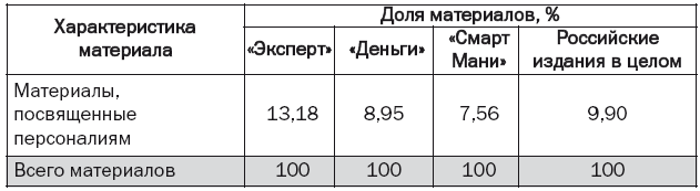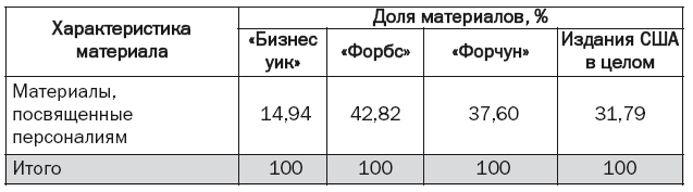 На основании таблиц 9 и 10 можно сделать однозначный вывод – американские журналы – прежде всего, журналы о людях, а российские – о бизнесе. Доля материалов, посвященных персоналиям, в отечественных СМИ в три раза меньше, чем в американских. Причем наибольшая доля таких текстов – в «Эксперте» (чуть более 13 %), но она все равно ниже, чем в самом «корпоративном» американском журнале «Бизнес уик» (почти 15 % площади). Традиционно внимательный к личностям бизнесменов «Форбс» отдает таким текстам 43 % от общего объема.