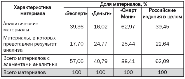 Однако усредненные результаты мало что говорят об огромной разнице в уровне аналитической работы корреспондентов в российских изданиях. Так, в «Смарт Мани» почти в четыре раза больше аналитических материалов, нежели в «Деньгах» – 63 % против 16 %. Всего материалов с элементами аналитики в «Смарт Мани» в два с лишним раза больше, чем в «Деньгах» – 88,4 % против 40,8 %.
