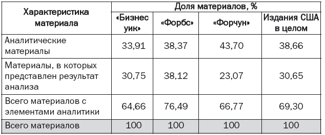 Вообще, в отличие от американских аналогов, где уровень аналитики незначительно варьируется в зависимости от журнала (см. табл. 12), в российском кластере можно выделить безусловного лидера – «Смарт Мани», где доля материалов с элементами аналитики превышает американский уровень – 88,4 % против 69 % (достаточно сказать, что ни один американский журнал уровня «Смарт Мани» не достигает). Явный аутсайдер среди российских деловых журналов – «Деньги», где доля текстов с элементами аналитики незначительно превышает 40 %.