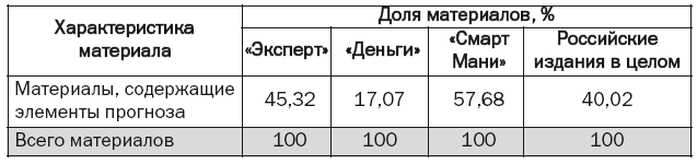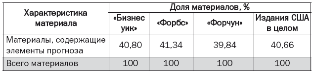Несмотря на практически равные показатели по удельному весу «прогнозных» материалов в российских и американских изданиях, только в журналах Соединенных Штатов доли таких текстов сопоставимы (во всех журналах «большой тройки» доля таких материалов составляет около 40 %). В России этот показатель варьируется от 17 % в «Деньгах» до 58 % в «Смарт Мани».