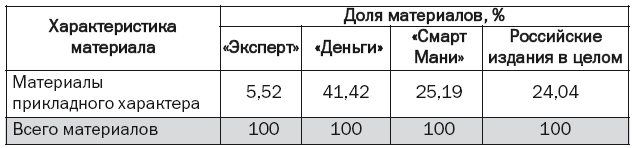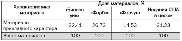 Последний показатель, который был проанализирован при сравнении американских и российских деловых журналов, – удельный вес в номере материалов «прикладного» характера. Несмотря на то, что большая часть материалов в деловых изданиях предоставляет полезную для читателей информацию, некоторые тексты содержат прямые, конкретные рекомендации о том, как заработать, сохранить, приумножить капитал либо потратить накопления.
