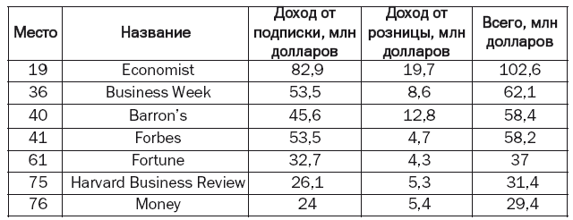 По сравнению с такими цифрами «потребительские» деловые журналы выглядят скромно. В сотне первых по тиражу журналов в 2007 году оказалось единственное деловое издание – журнал о персональных финансах «Мани» (Money) с разовым оплаченным тиражом 1 921 436 экземпляров (38-е место)33. Ни «Форбс», ни «Форчун», ни «Бизнес уик» в список ста самых тиражных не попали. В 2007 году «Форбс» выходил тиражом «всего лишь» в 928 507 экземпляров, «Бизнес уик» – 926 455 экземпляров, а «Форчун» – 862 706 экземпляров34. Правда, при оценке тиражей «Форбса», «Форчуна» и «Бизнес уика» надо обращать внимание на периодичность их выхода («Форбс» и «Форчун» выходят раз в две недели, «Бизнес уик» – еженедельно).