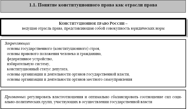 Конституционное право – ведущая отрасль права России, представляющая собой совокупность юридических норм, закрепляющих основы государственного (конституционного) строя; основы прав и свобод человека и гражданина; федеративное устройство РФ; основы избирательной системы; основы правового статуса депутата; основы организации и деятельности органов государственной власти; основы статуса местного самоуправления; призванных регулировать властеотношения и оптимально сбалансировать соотношение сил социально-политических групп, участвующих в осуществлении государственной власти.