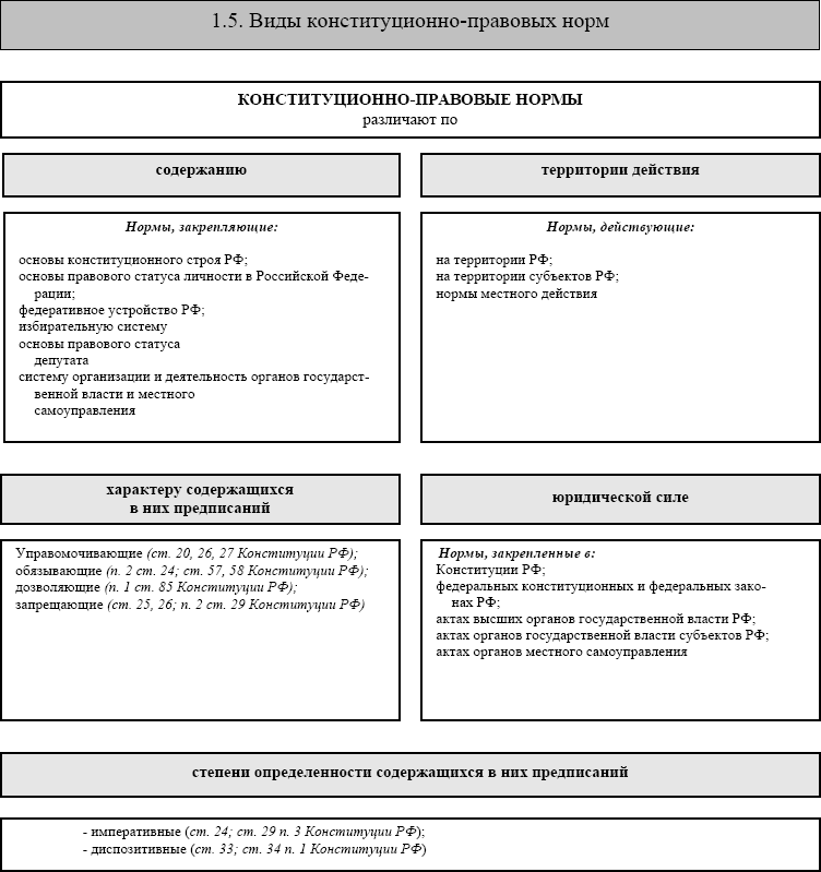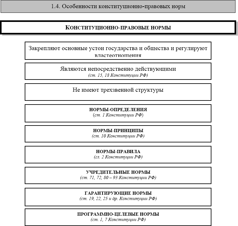 Нормы конституционного права устанавливают принципы государственного устройства, его деление на государства, национально-государственные, политико-территориальные и административно-территориальные образования, определяют формы государственных связей между государством в целом и его частями, их правовой статус.