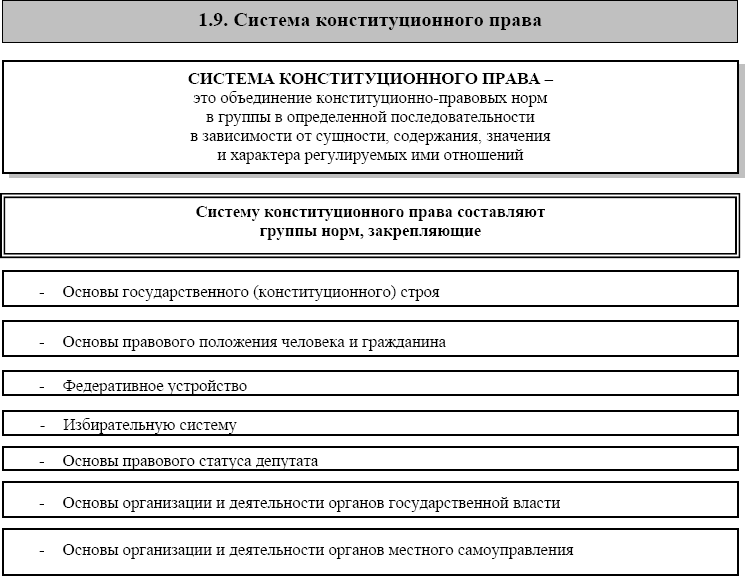 Система конституционного права теснейшим образом связана с Конституцией РФ. И это не случайно, так как важнейшие конституционно-правовые институты находят свое выражение и закрепление в Конституции. Но было бы неправильным, как это делают многие ученые, полностью отождествлять систему конституционного права с системой Конституции. Без преувеличения стоит отметить, что системы конституций стран мира, как и наша конституция, по многим причинам далеки от научного идеала. В первую очередь по политическим, а во вторую – по временным. Конституции чаще всего разрабатывались и принимались в сложных обстоятельствах, не позволяющих качественно проработать основные их положения, да и политический умысел составителей давал о себе знать, что не могло негативно не отразиться и на демократизме конституций.