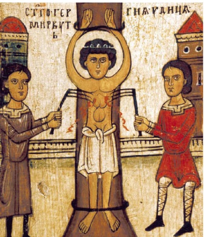 Тогда Диоклетиан повелел принести сапоги железные, раскалить длинные гвозди, вбитые в подошву их, обуть мученика в эти сапоги и гнать его с побоями до темницы. Когда гнали мученика, обутого таким образом, мучитель, издеваясь, говорил:
