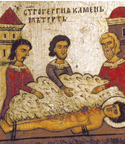 – Спаситель скорбящих, прибежище гонимых, надежда безнадежных, Господи Боже мой! Услышь молитву раба Твоего, призри на меня и помилуй меня. Избавь меня от коварств супротивного и дай мне соблюсти до конца моей жизни исповедание имени Твоего Святого. Не оставь меня, Владыка, за мои грехи, чтобы не сказали мои враги: «Где Бог его?» Покажи силу Твою и прославь имя Твое во мне, непотребном рабе Твоем. Пошли мне Ангела, хранителя меня недостойного, – Ты, претворивший печь вавилонскую в росу и сохранивший Твоих отроков невредимыми, ибо Ты благословен вовеки. Аминь. Так помолившись и оградив себя крестным знамением, Георгий вошел в ров, радуясь и славя Бога. Связав мученика и, согласно повелению, засыпав его во рву негашеной известью, слуги императора удалились.