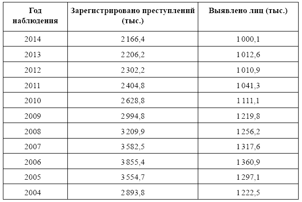 Так, за 2014 год органами внутренних дел рассмотрено 29,28 млн заявлений, сообщений о преступлениях, об административных правонарушениях, о происшествиях, что на 3,3 % больше, чем за 2013 год (без учета Крымского федерального округа); для сравнения: