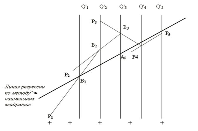 Пример. Верхняя половина графика иллюстрирует метод нахождения an (здесь N = 5). На нижней части графика показан обратный метод нахождения B1, а линия B1A5 дает оцененную линию регрессии: сумма квадратов расстояний точек графика (уровни преступности) от прямой (линии регрессии) минимальная.