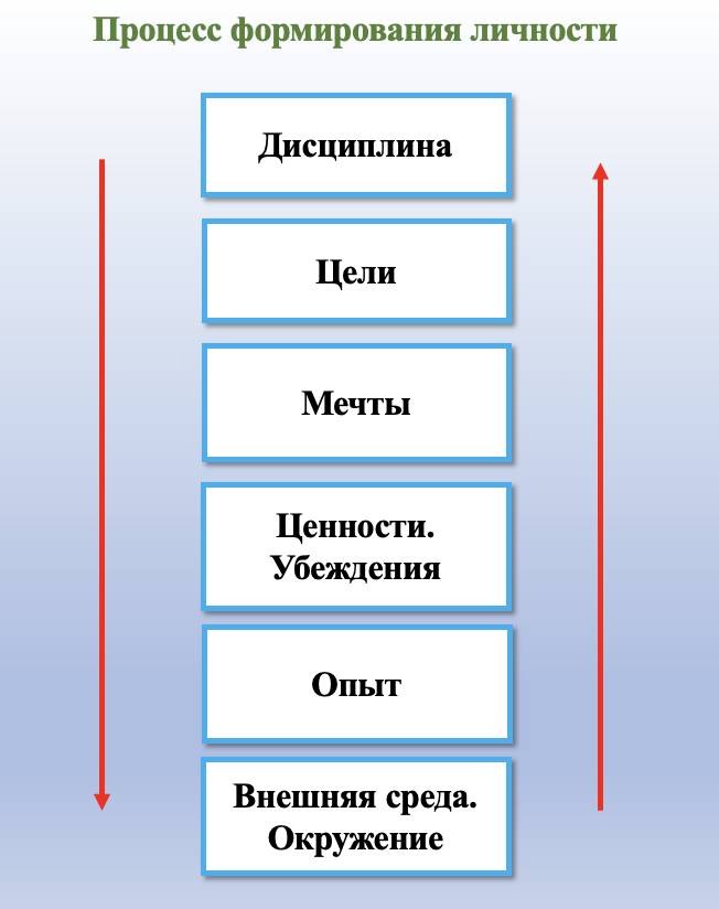 То есть этот перечень работает в эту сторону (вниз) и может работать наоборот (вверх). Как говорится в простонародье: «С кем поведешься, у того и наберешься!» Если будешь общаться с пятью миллионерами, ты будешь шестым миллионером. Если будешь общаться с пятью идиотами, ты будешь шестым идиотом. То есть во многом зависит окружение от твоего успеха. Но также не нужно забывать, что мы можем проработать отдельные части формирования нашей личности.