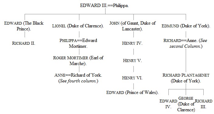 On the following page we have a genealogical table of the family of Edward III. At the head of it we have the names of Edward III. and Philippa his wife. In a line below are the names of those four of his sons whose descendants figure in English history. It was among the descendants of these sons that the celebrated wars between the houses of York and Lancaster, called the wars of the roses, arose.