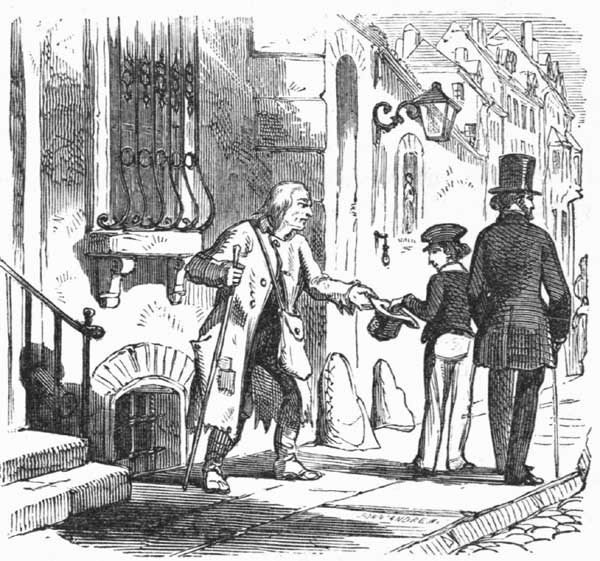 Very soon an old beggar man came limping along on a crutch, with a countenance haggard and miserable, and, advancing to them, held out his cap for alms. Mr. George, who thought it was not best to give to beggars in the streets, was going on without regarding him; but the man hobbled on by the side of the strangers, and seemed about to be as pertinacious as the commissioner. They went on so for a little distance, when at length, just as the man was about giving up in despair, Rollo put his hand in his pocket, and feeling among the money there, happened to bring up a small copper coin, which he at once and instinctively dropped into the beggar's cap. He performed the movement a little slyly, so that Mr. George did not see him. This he was able to do from the fact that the beggar was on his side, and not on Mr. George's, and, moreover, a little behind.