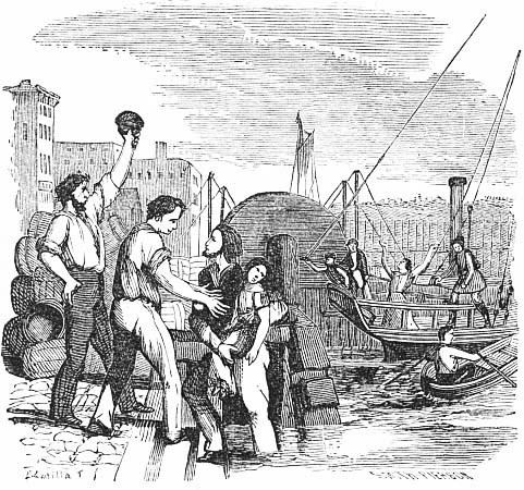 Rollo was not disappointed, when he came to visit the docks, in respect to the interesting and amusing incidents that he expected to see there. He saw a great many such incidents, and one which occurred was quite an uncommon one. A little girl fell from the pier head into the water. The people all ran to the spot, expecting that she would be drowned; but, fortunately, the place where she fell in was near a flight of stone steps, which led down to the water. The people crowded down in great numbers to the steps, to help the child out. The occurrence took place just as the men from the docks were going home to dinner; and so it happened that there was an unusually large number of people near at the time of the accident.