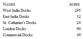 The first set of docks that was made was called the West India Docks. They were made about the year 1800. Very soon afterwards several others were commenced; and now there are five. The following table gives the names of them, with the number of acres enclosed within the walls of each:—