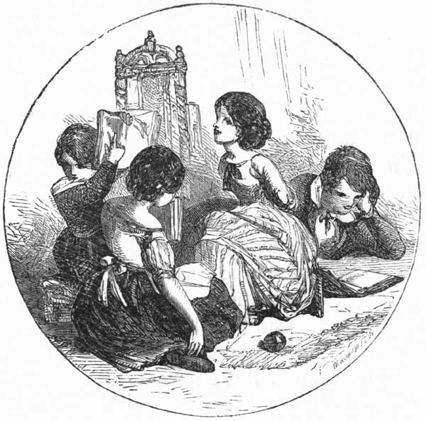 Mr. George and the children gazed around upon the confused mass of ruined bastions, towers, battlements, and archways, that lay before them, with a feeling of awe which it is impossible to describe. The grass waved and flowers bloomed on the tops of the walls, on the sills of the windows, and on every projecting cornice, or angle, where a seed could have lodged. In many places thick clusters of herbage were seen growing luxuriantly from crumbling interstices of the stones in the perpendicular face of the masonry, fifty feet from the ground. Large trees were growing on what had formerly been the floors of the halls, or of the chambers, and tall grass waved there, ready for the scythe.
