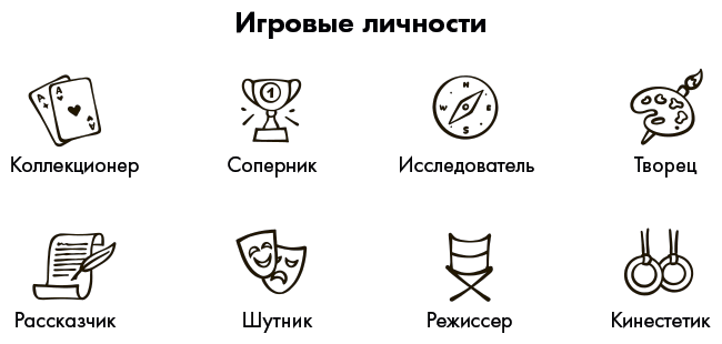 Браун обнаружил, что большинство людей склонны к одному-двум типам игровых персонажей. Поняв, какие из них подходят вам больше всего, вы сможете проявить свою «игровую личность», которая выпустит на свободу ваше чувство приключения{12}. Ниже представлены восемь «игровых личностей», которые Стюарт Браун выделил по итогам своих исследований.