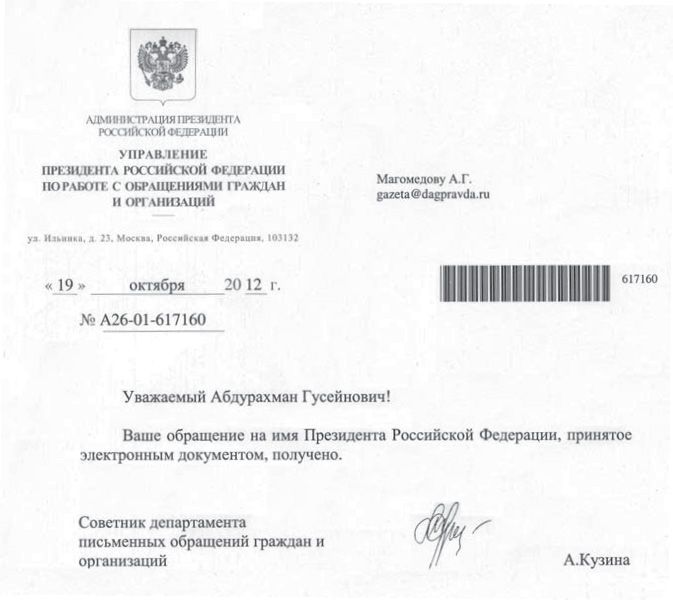 Это письмо не чей-то заказ. Это мнение дагестанского журналиста, награжденного Государственным военным историко-культурным Центром при Правительстве Российской Федерации медалью «Патриот России». Я знаю мнение дагестанцев не только по письмам в редакцию. Они в абсолютном своем большинстве такие же патриоты России, как и я, и они ждут на государственном уровне противодействия деструктивным антикавказским настроениям.