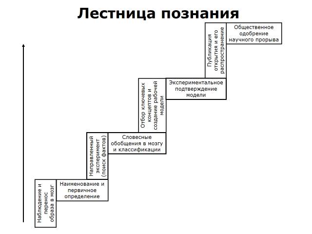 Проверка полученных результатовМы обязаны проверить, как функционирует система на практике. Контроль над системой начинается задолго до окончания работы над ее созданием. По этому критерию проверка разделяется на две категории: на пошаговую проверку наших посылок в процессе построения системы и на проверку эффективности системы в реальной действительности после окончания работы по ее созданию. Второй вариант проверки опять-таки подразделяется на две категории: немедленная проверка (обычно с участием независимых экспертов) и отложенная проверка с применением приборов и фиксацией бесперебойной работы нового продукта. Последний вид проверки может растянуться на многие годы. Все вышеизложенное по поводу создания знаковых систем я могу представить в виде диаграммы, которую я назвал «Лестницей познания» и помещаю здесь.