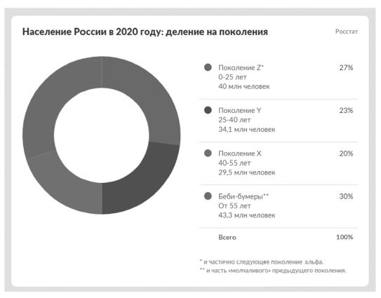 Для России использование терминов «поколение икс», «поколение игрек» и т. п. более свойственно популярной культуре, нежели академическим демографическим исследованиям. По этой причине мы можем лишь приблизительно соотнести данные отечественной статистики с теми цифрами по США, что приводит автор.