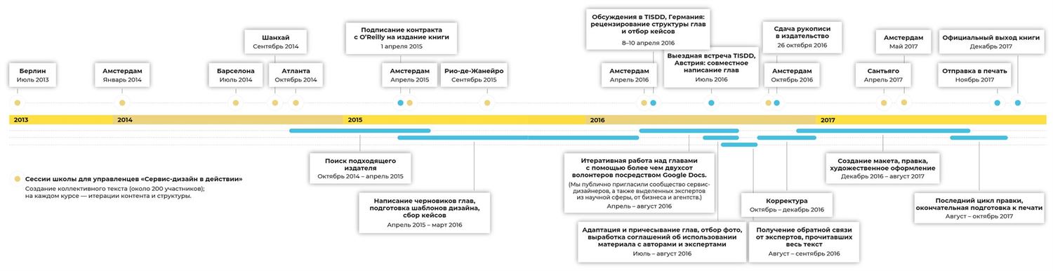 Основываясь на первоначальном черновике, мы примерно прикинули, что должно войти в книгу, и разработали стратегию ее коллективного создания. Это привело к серии предложений о сотворчестве и содействии. Мы пригласили ведущих практиков сервис-дизайна, работающих в разных сферах и странах, представить кейсы, показывающие, как определенные инструменты и методы применяются в том или ином контексте. Через временный сайт tisdd.rocks мы призвали более широкое сообщество сервис-дизайнеров вносить свой вклад в наш проект. Не прошло и часа, как две сотни человек вызвались рецензировать черновики всех 12 глав книги. Начались интенсивные обсуждения и правки. С помощью итераций мы стали продвигаться вперед.