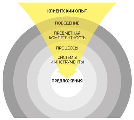 Опыт, получаемый клиентом от нашего предложения, проходит через фильтр восприятия нашего поведения, компетентности, процессов, систем и инструментов. Клиенты воспринимают наши решения лишь через вуали всех этих слоев, обычно начиная с самого внешнего[7].