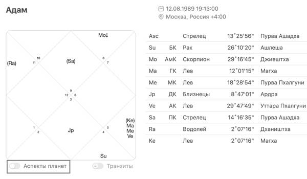 Также я рекомендую переключить указатель «Аспекты планет» в неактивный режим. Если не сделать этого, вы увидите в карте обилие разных обозначений, часть из которых написана серым цветом (лишних на данный момент). Когда отключите «Аспекты планет», эти серые обозначения исчезнут. Вам именно это и нужно.