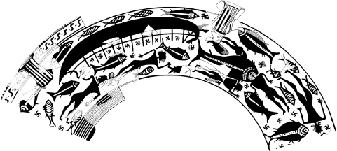 On its grey and rapidly painted body, a ship floats all wrong in the sea, turned over in a gale, its curved hull now awash, its prow and stern pointing down to the seabed. Everything has fallen out. Wide-shouldered and huge-haunched men are adrift in the ocean beneath, their hair ragged, their arms flailing for shore and safety. Striped and cross-hatched fish, some as big as the men, others looking on, swim effortlessly in the chaos. A scattering of little swastikas does little to sanctify this fear-filled waterworld. One man’s head is disappearing into the mouth of the biggest fish of all. It is a disaster, fuelled by the fear the Greeks had of the creatures of the sea, alien animals which, as Achilles taunts one of his victims, ‘will lick the blood from your wounds and nibble at your gleaming fat’. The scene is no new invention; it is painted with all the rapidity and ease of having been painted many times before.