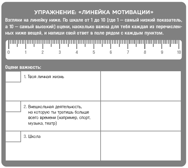 Убедить тебя в том, что на уроках на самом деле интересно, было бы практически невозможно, поэтому я не буду тратить на это время. Однако вот в чем дело: школа обязательна и есть несколько веских причин получать достойные оценки. Я знаю, ты это понимаешь и, несмотря ни на что, действительно хочешь добиться большего. А теперь давай выполним простое упражнение. Оно называется «Линейка мотивации», потому что измеряет, насколько ты мотивирован. Это может показаться немного банальным, но попробуй.