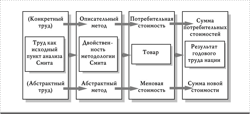 Из схемы видно, что полученная Смитом двойственность результатов годового труда нации отражает в конечном счете двойственную природу труда, а также товара, представляющего собой противоречивое единство потребительной стоимости (полезности) и стоимости.