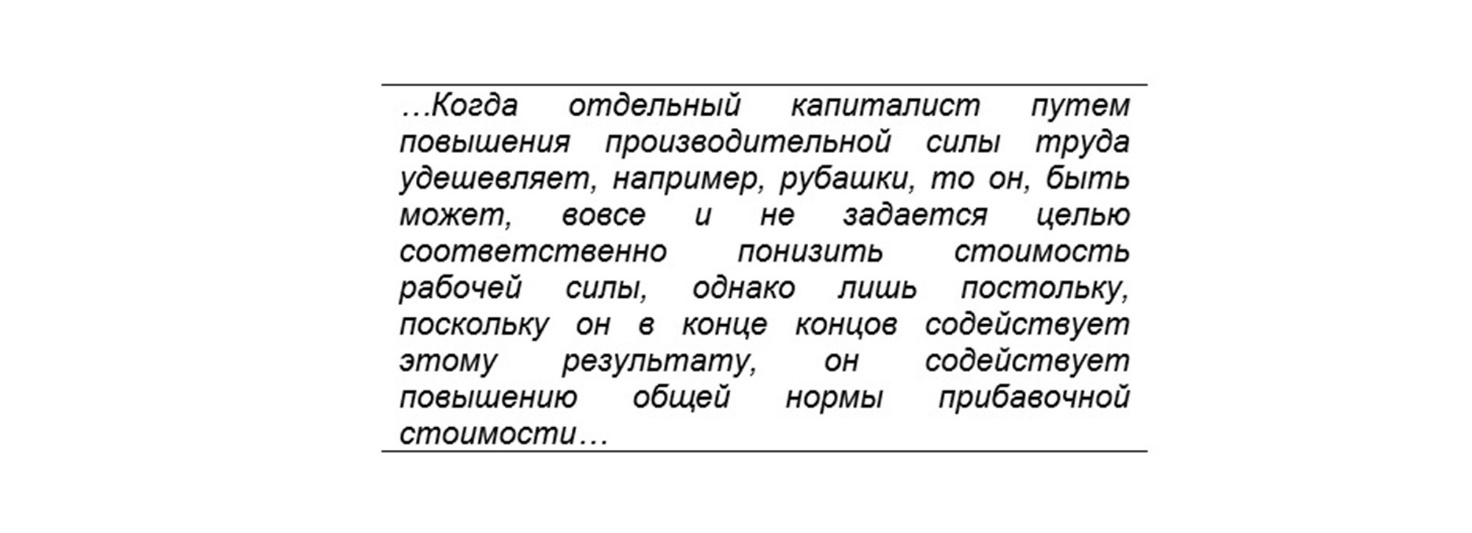 Хотелось бы отметить сразу, что уже давно встречается рабочий день и по 6 часов, и по 4 часа, а рабочая неделя в 3-4 дня, не говоря о фрилансерах со свободным графиком. Одно понятно точно – если дать возможность, то (полу)капиталисты заставят работать сутками напролет и причем бесплатно. Это не происходит по одной единственной причине – что производит общество, то оно само и потребляет как конечный потребитель, если бы не это, то рабочие бы умирали вследствие чрезмерной эксплуатации. Верно одно – капиталисту нужны «рты» для товаров, производимых под его началом, и эта ситуация, в свою очередь, является единственно действенным и сдерживающим рычагом от чрезмерной эксплуатации рабочих.