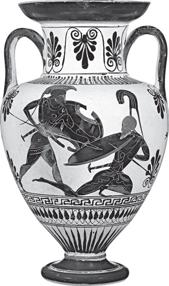 Рис. 1. Героическая битва гоплитов: сражение одинаково экипированных греческих воинов с конвенциональным оружием – копьями и щитами. Аттическая чернофигурная амфора, 500–480 гг. до н. э. Музей Дж. Пола Гетти.
