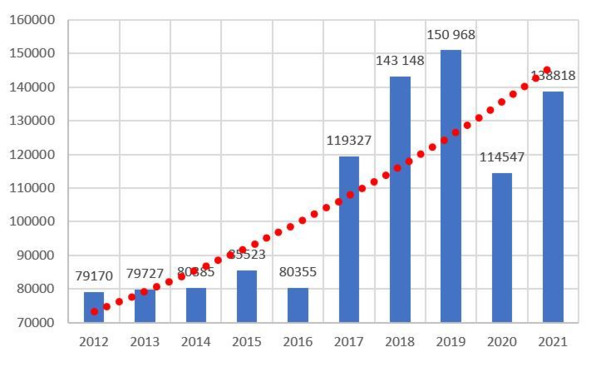 Рис. 1. Количество дел об АП, возбужденных таможенными органами Российской Федерации в 1012—2021 гг.