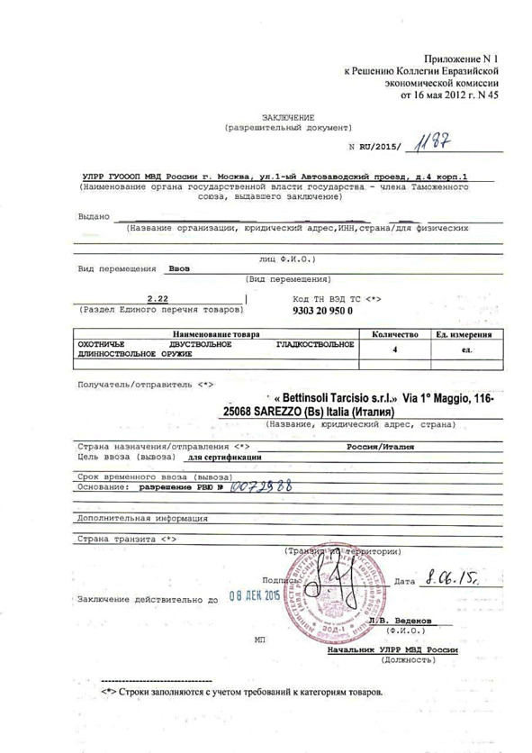 В Российской Федерации ввоз и (или) вывоз оружия осуществляется при наличии заключения (разрешительного документа – Рис. 1) Федеральной службы войск национальной гвардии. Ввоз и (или) вывоз физическими лицами оружия в качестве товаров для личного пользования также осуществляется при наличии заключения (разрешительного документа).
