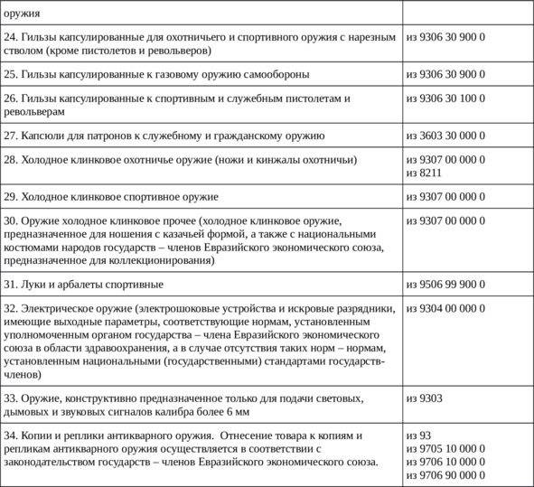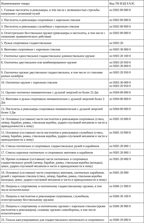 К данной категории товаров относятся: огнестрельное, холодное, сигнальное, пневматическое оружие, предназначенное для использования в целях самообороны, занятий спортом, охотой, культурных и образовательных целей. К данной категории товаров также относятся основные (составные) части оружия, такие как ствол, затвор, барабан, рамка, ствольная коробка (колодка), цевье, ударно-спусковой механизм и части и принадлежности к нему, а также патроны, гильзы капсулированные и капсюли для патронов. Перечень служебного и гражданского оружия, его основных (составных) частей и патронов к нему в соответствии с Решением Коллегии Евразийской экономической комиссии от 21.04.2015 №304 представлен в таблице 1.