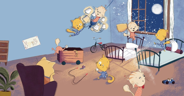 It was time for the kittens to go to bed, but Lucy and Tynn were having too much fun. They played, jumped, and tumbled on their beds. Every minute, it seemed, the kittens came up with a new game. They really did not want to go to sleep.