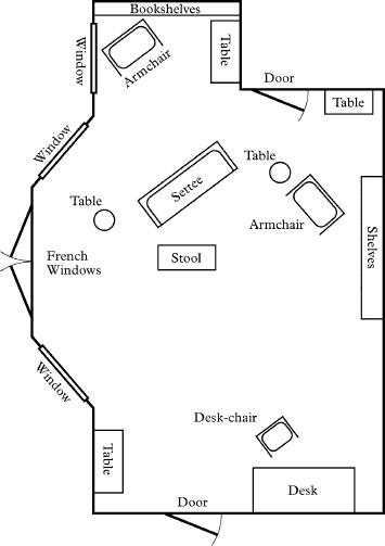 Inside the room, he paused again, as though attempting to discern any sound or movement. Then, ‘Hello,’ he called. ‘Is anyone there?’ Flashing his torch around the room which revealed itself to be a well-furnished study, its walls lined with books, he saw in the centre of the room a handsome middle-aged man sitting in a wheelchair facing the french windows, with a rug over his knees. The man appeared to have fallen asleep in his chair. ‘Oh, hello,’ said the intruder. ‘I didn’t mean to startle you. So sorry. It’s this confounded fog. I’ve just run my car off the road into a ditch, and I haven’t the faintest idea where I am. Oh, and I’ve left the window open. I’m so sorry.’ Continuing to speak apologetically as he moved, he turned back to the french windows, shut them, and closed the curtains. ‘Must have run off the main road somewhere,’ he explained. ‘I’ve been driving round these topsy-turvy lanes for an hour or more.’